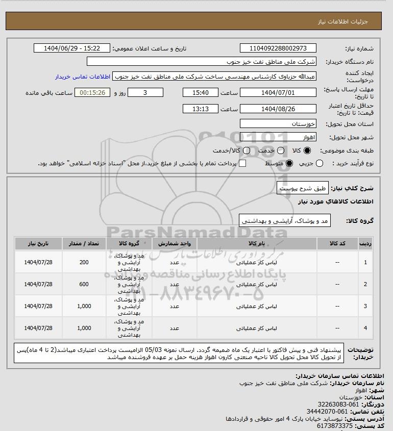 | 1 | -- | لباس کار عملیاتی | عدد | مد و پوشاک، آرایشی و بهداشتی | 200 | 1404/07/28 |