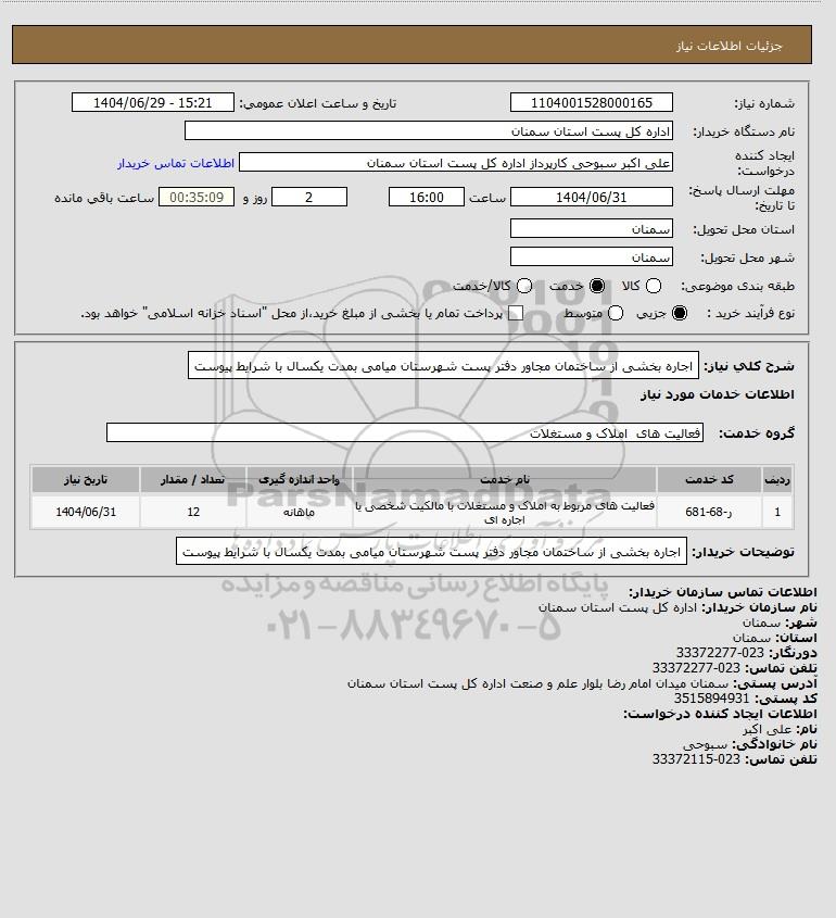 شرح کلی نیاز: اجاره بخشی از ساختمان مجاور دفتر پست شهرستان میامی بمدت یکسال با شرایط پیوست