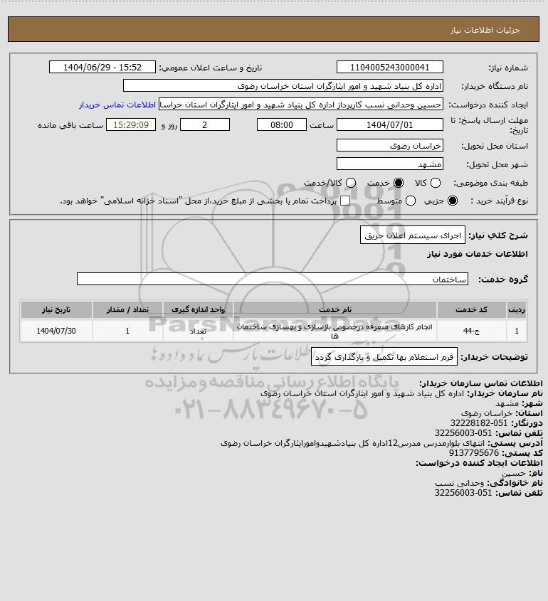 نام دستگاه خریدار:اداره کل بنیاد شهید و امور ایثارگران استان خراسان رضوی