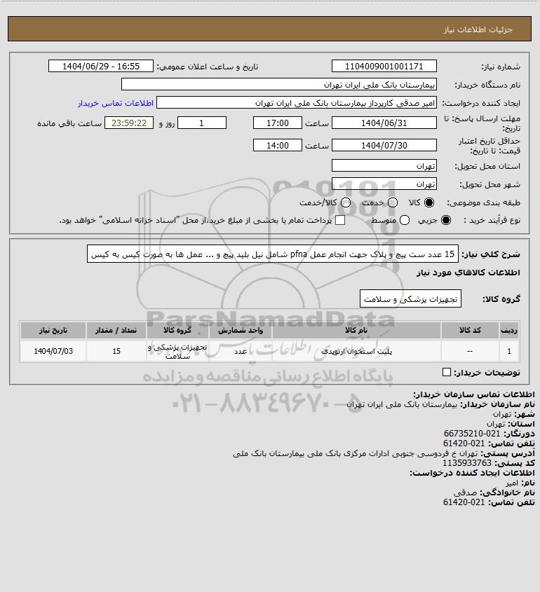 استعلام 15 عدد ست پیچ و پلاک جهت انجام عمل pfna شامل نیل بلید پیچ و ... عمل ها به صورت کیس به کیس, استعلام 15 عدد ست پیچ و پلاک جهت انجام عمل pfna شامل نیل بلید پیچ و ... عمل ها به صورت کیس به کیس