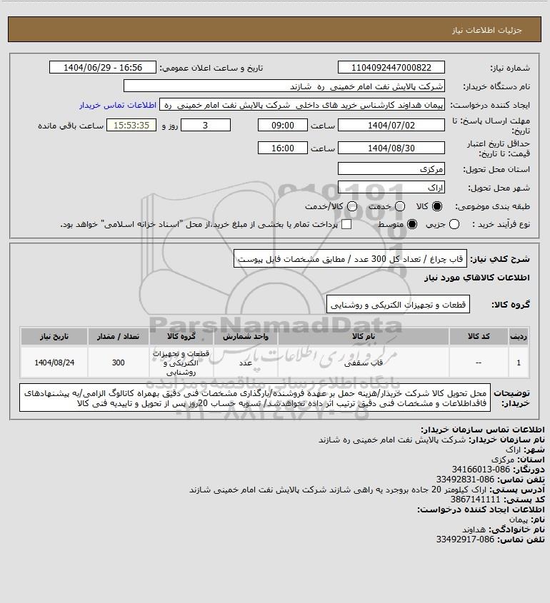 شرح کلی نیاز: قاب چراغ / تعداد کل 300 عدد / مطابق مشخصات فایل پیوست
