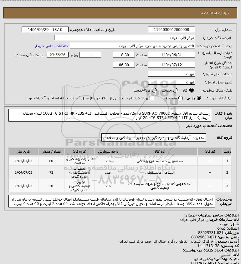 | 1 | -- | ضدعفونی کننده سطوح پزشکی | عدد | تجهیزات پزشکی و سلامت | 60 | 1404/07/05 |