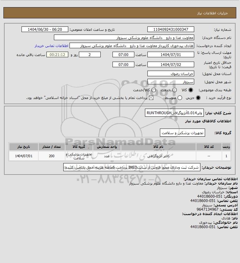 شرح کلی نیاز: وایر0.014آنژیوگرافیRUNTHROUGH