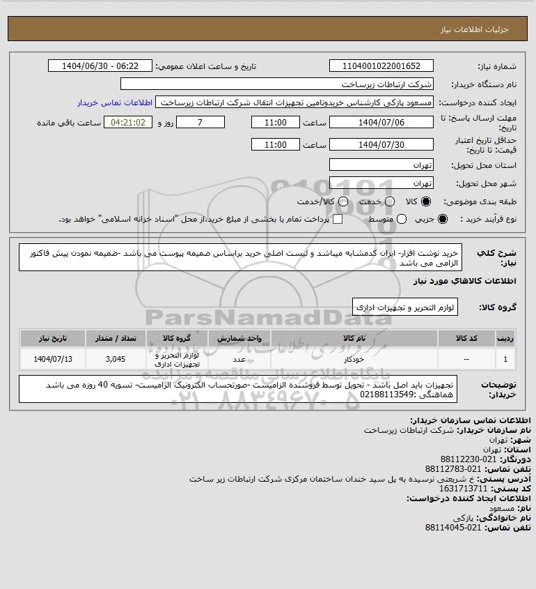 شرح کلی نیاز: خرید نوشت افزار- ایران کدمشابه میباشد و لیست اصلی خرید براساس ضمیمه پیوست می باشد -ضمیمه نمودن پیش فاکتور الزامی می باشد