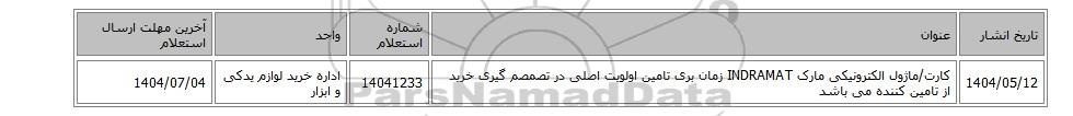1404/05/12کارت/ماژول ‎الکترونیکی مارک INDRAMAT زمان بری تامین اولویت اصلی در تصمصم گیری خرید از تامین کننده می باشد14041233اداره خرید لوازم یدکی و ابزار1404/07/04