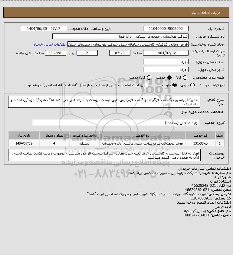شرح کلی نیاز: تعمیرکالیبراسیون یک عدد فرگردان و 3 عدد فرترکیبی طبق لیست پیوست با کارشناس خرید هماهنگ شود/4 مورد/پرداخت:دو ماه اداری