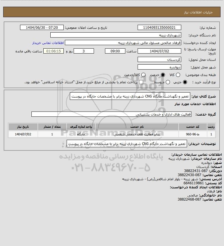 استعلام تعمیر و نگهداشت جایگاه CNG شهرداری زرینه برابر با مشخصات جایگاه در پیوست, استعلام تعمیر و نگهداشت جایگاه CNG شهرداری زرینه برابر با مشخصات جایگاه در پیوست