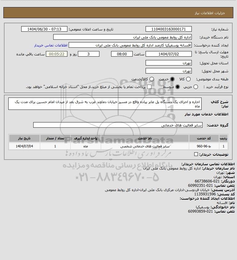 شرح کلی نیاز: اجاره و اجرای یک دستگاه پل عابر پیاده واقع در مسیر خیابان دماوند غرب به شرق بعد از میدان امام حسین برای مدت یک ماه