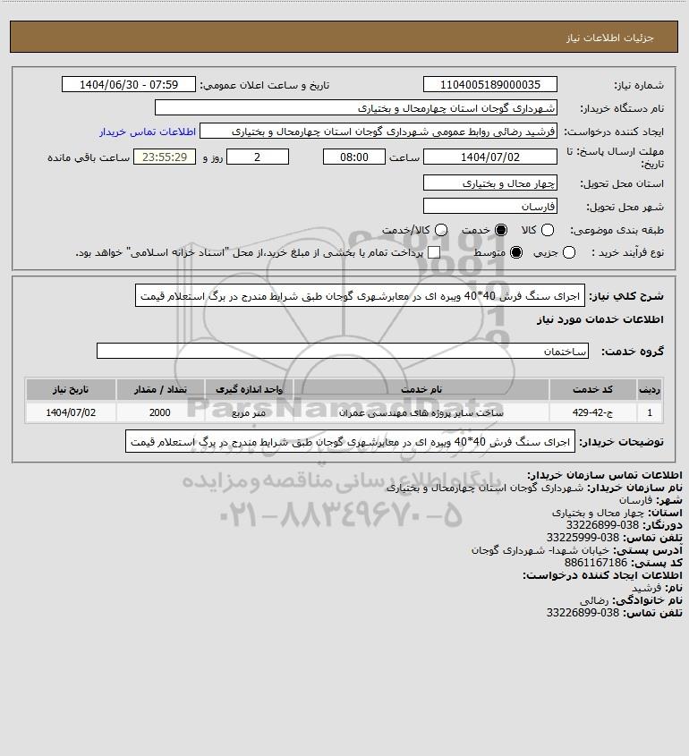 شرح کلی نیاز: اجرای سنگ فرش 40*40 ویبره ای در معابرشهری گوجان طبق شرایط مندرج در برگ استعلام قیمت