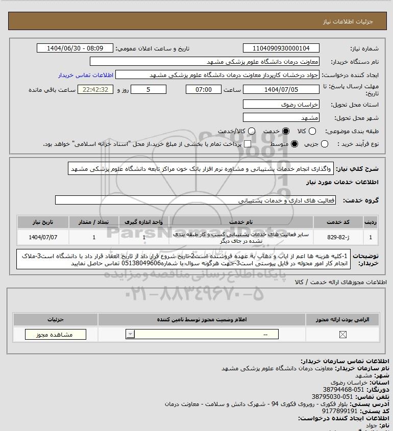 شرح کلی نیاز: واگذاری انجام خدمات پشتیبانی و مشاوره نرم افزار بانک خون مراکز تابعه دانشگاه علوم پزشکی مشهد