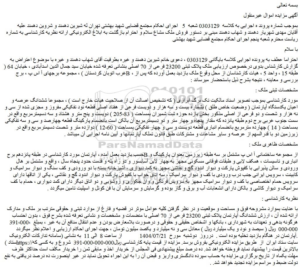 احتراما عطف به پرونده اجرایی کلاسه بایگانی 0303129 ، دعوی خانم شیرین دهمند و غیره بطرفیت آقای شهاب دهمند و غیره با موضوع اعتراض به گزارش کارشناس بدوی درخصوص ارزیابی ملک پلاک ثبتی 23200 فرعی از 70 اصلی بنشانی تعرفه شده خیابان سید جمال الدین اسدآبادی ، خیابان 64 ( غرب اتوبان کردستان ) ، مجموعه برجهای آ اس پ ، برج b ، طبقه 15 ، واحد 5 ، هیات کارشناسان از محل وقوع ملک بازدید بعمل آورده که پس از بررسی و معاینه ، نتیجه بشرح ذیل باستحضار میرساند :
