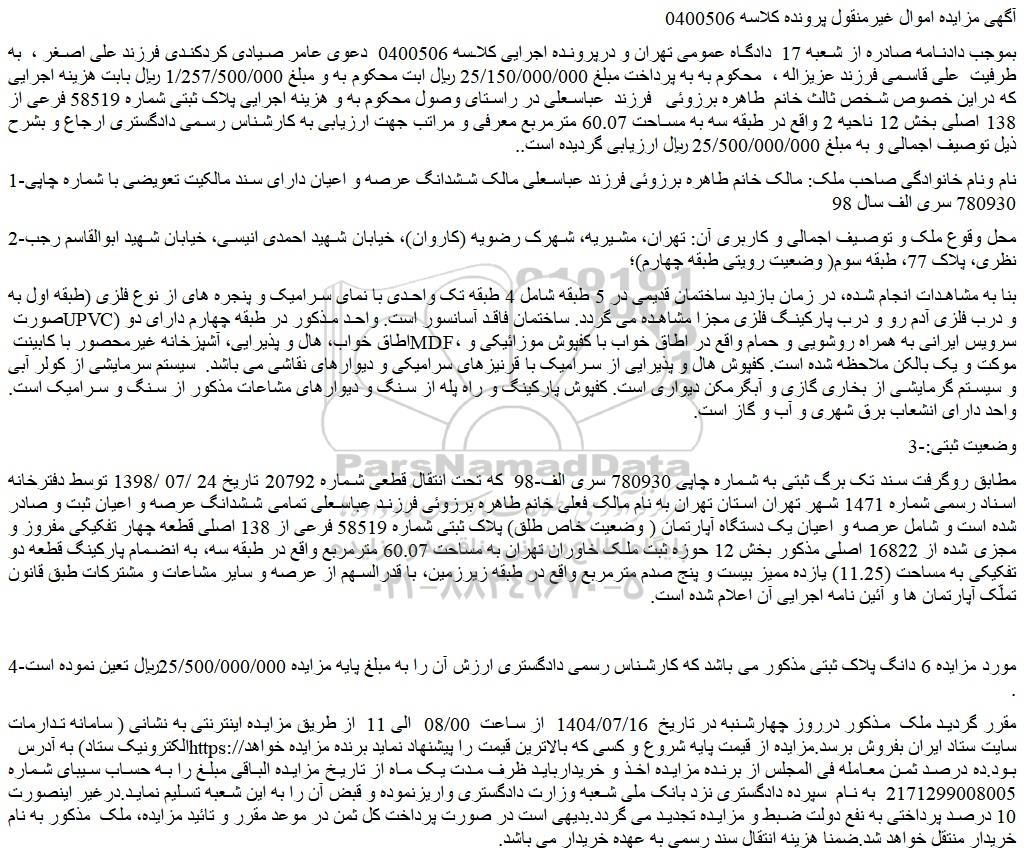 بموجب دادنامه صادره از شعبه 17  دادگاه عمومی تهران و درپرونده اجرایی کلاسه 0400506  دعوی عامر صیادی کردکندی فرزند علی اصغر ،  به طرفیت  علی قاسمی فرزند عزیزاله ،  محکوم به به پرداخت مبلغ 25/150/000/000 ریال ابت محکوم به و مبلغ 1/257/500/000 ریال بابت هزینه اجرایی که دراین خصوص شخص ثالث خانم  طاهره برزوئی   فرزند  عباسعلی در راستای وصول محکوم به و هزینه اجرایی پلاک ثبتی شماره 58519 فرعی از 138 اصلی بخش 12 ناحیه 2 واقع در طبقه سه به مساحت 60.07 مترمربع معرفی و مراتب جهت ارزیابی به کارشناس رسمی دادگستری ارجاع و بشرح ذیل توصیف اجمالی و به مبلغ 25/500/000/000 ریال ارزیابی گردیده است..