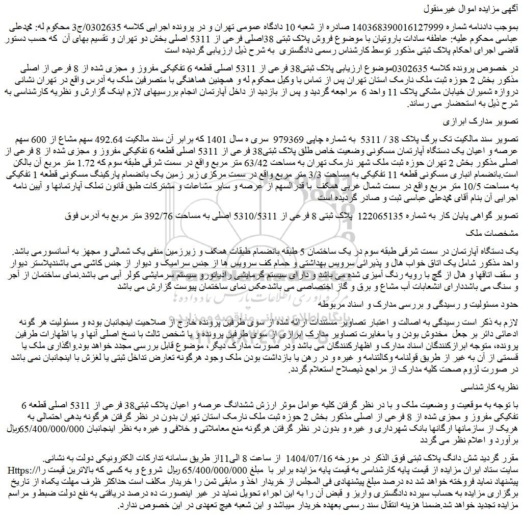 بموجب دادنامه شماره 140368390016127999 صادره از شعبه 10 دادگاه عمومی تهران و در پرونده اجرایی کلاسه 0302635/ج3 محکوم له: محمدعلی عباسی محکوم علیه: عاطفه سادات باروتیان با موضوع فروش پلاک ثبتی 38اصلی فرعی از 5311 اصلی بخش دو تهران و تقسیم بهای آن که حسب دستور قاضی اجرای احکام پلاک ثبتی مذکور توسط کارشناس رسمی دادگستری به شرح ذیل ارزیابی گردیده است