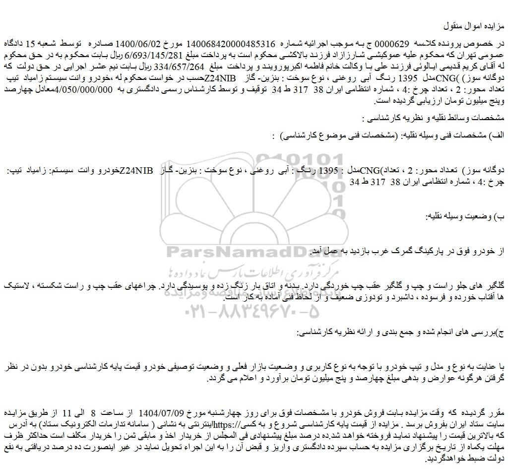 در خصوص پرونده کلاسه  0000629 ج به موجب اجرائیه شماره  140068420000485316 مورخ 1400/06/02 صادره   توسط  شعبه 15 دادگاه عمومی تهران که محکوم علیه عموکیشی شارزازاد فرزند بالاکشی محکوم است به پرداخت مبلغ 6/693/145/281 ریال بابت محکوم به در حق محکوم له آقای کریم قدیمی ایالوئی فرزند علی با وکالت خانم فاطمه اکبرپورویند و پرداخت  مبلغ  334/657/264 ریال بابت نیم عشر اجرایی در حق دولت  که حسب در خواست محکوم له ،خودرو وانت سیستم زامیاد  تیپ z24nib  مدل  1395 رنگ  آبی  روغنی ، نوع سوخت : بنزین- گاز cng(دوگانه سوز)  تعداد محور: 2 ، تعداد چرخ :4 ، شماره انتظامی ایران 38  317 ط 34  توقیف و توسط کارشناس رسمی دادگستری به  4/050/000/000معادل چهارصد وپنج میلیون تومان ارزیابی گردیده است.