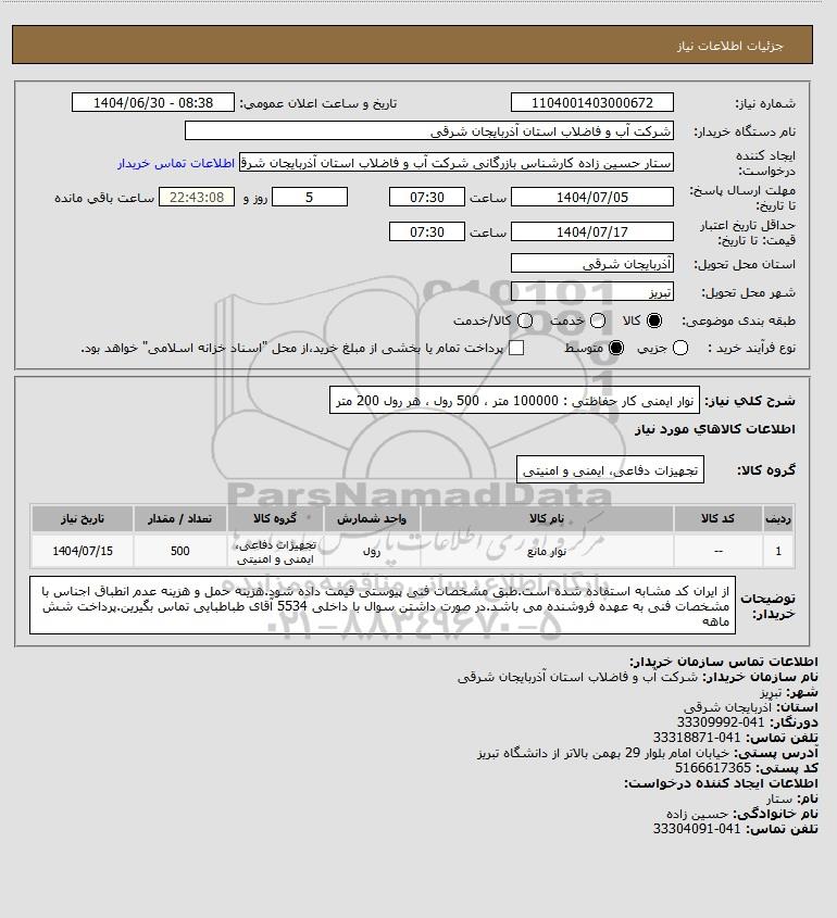 شرح کلی نیاز: نوار ایمنی کار حفاظتی : 100000 متر ، 500 رول ، هر رول 200 متر
