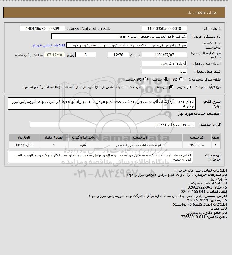 توضیحات خریدار:انجام خدمات آزمایشات آلاینده سنجی بهداشت حرفه ای و عوامل سخت و زیان آور محیط کار شرکت واحد اتوبوسرانی تبریز و حومه