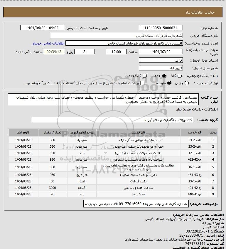 شرح کلی نیاز: بهسازی ، کاشت چمن و درخت ودرختچه ، حفظ و نگهداری ، حراست و تنظیف