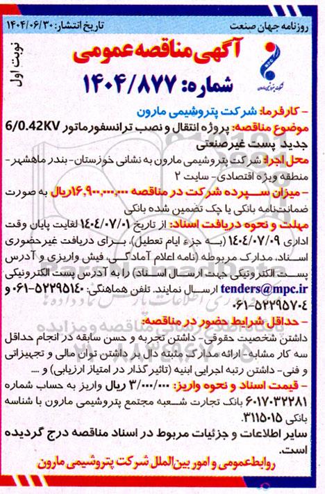 موضوع مناقصه پروژه انتقال و نصب ترانسفورماتور 6.0.42KV جدید پست غیر صنعتی