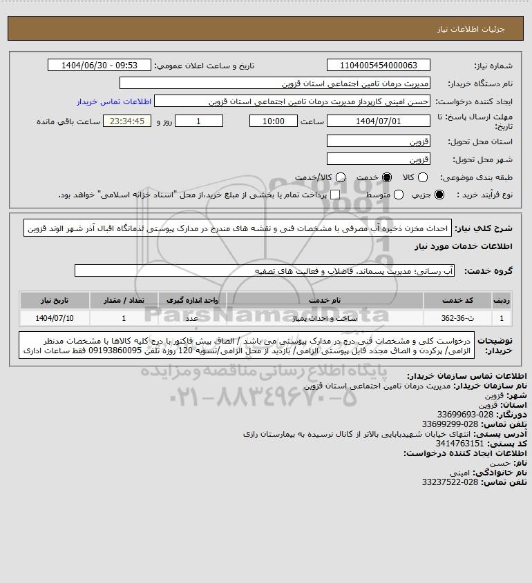 شرح کلی نیاز: احداث مخزن ذخیره آب مصرفی با مشخصات فنی و نقشه های مندرج در مدارک پیوستی ئذمانگاه اقبال آذر شهر الوند قزوین