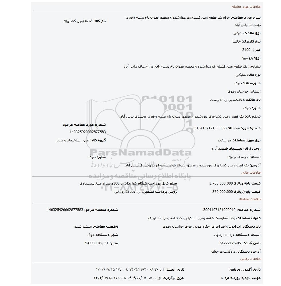 | شرح مورد معامله: حراج یک قطعه زمین کشاورزی دیوارشده و محصور بعنوان باغ پسته واقع در روستای بیاس آباد | نام کالا: قطعه زمین کشاورزی | |