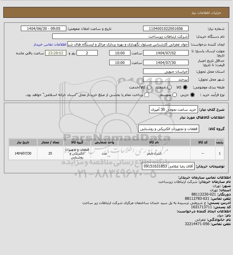 | 1 | -- | کنترل تایمر | عدد | قطعات و تجهیزات الکتریکی و روشنایی | 25 | 1404/07/30 |