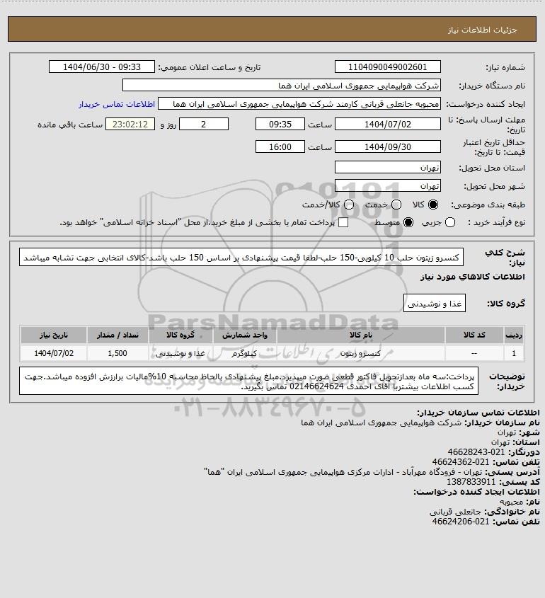 شرح کلی نیاز: کنسرو زیتون حلب 10 کیلویی-150 حلب-لطفا قیمت پیشنهادی بر اساس 150 حلب باشد-کالای انتخابی جهت تشابه میباشد