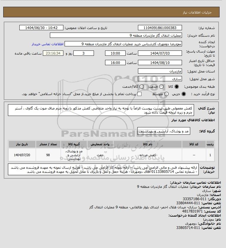 نام دستگاه خریدار:عملیات انتقال گاز مازندران منطقه 9