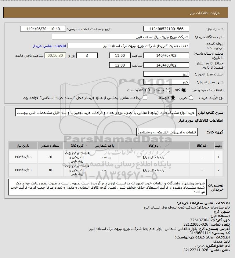 1 -- پایه یا دکل چراغ عدد قطعات و تجهیزات الکتریکی و روشنایی 30 1404/07/13