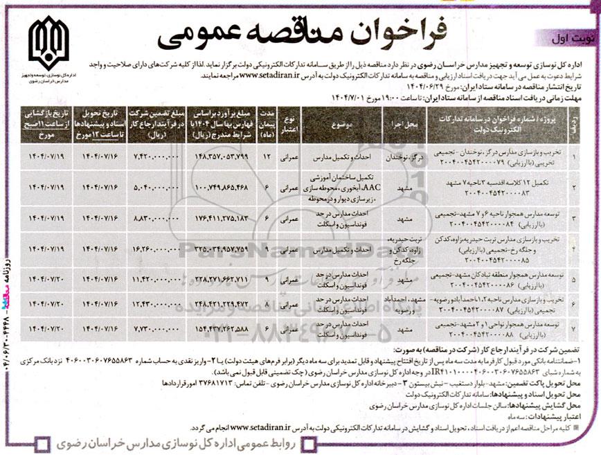 | 5 | توسعه مدارس همجوار منطقه تبادکان مشهد-تجمیعی (با ارزیابی) 2004004542000086 | مشهد | احداث مدارس در حد فونداسیون و اسکلت | 9 | 228.271.662.711 | 11.420.000.000 | 1404.7.20 |