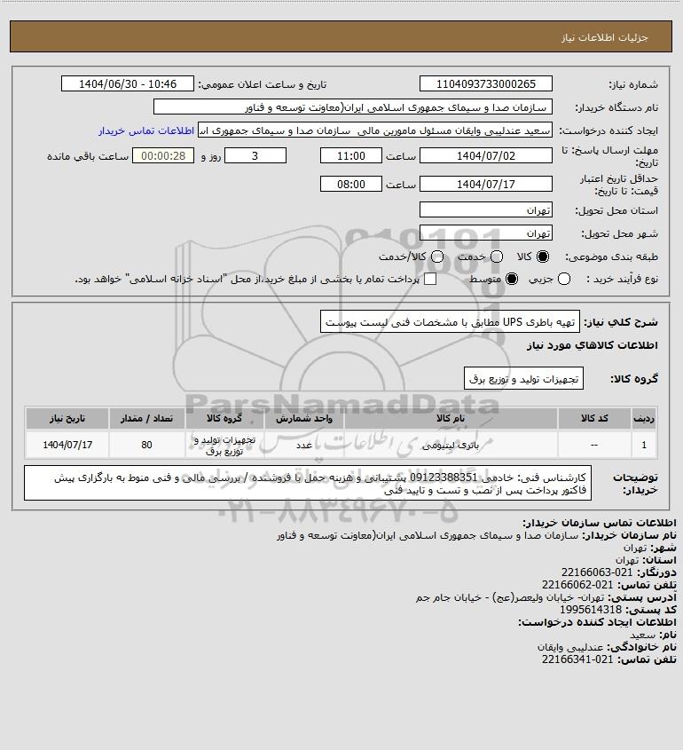 شرح کلی نیاز: تهیه باطری UPS مطابق با مشخصات فنی لیست پیوست