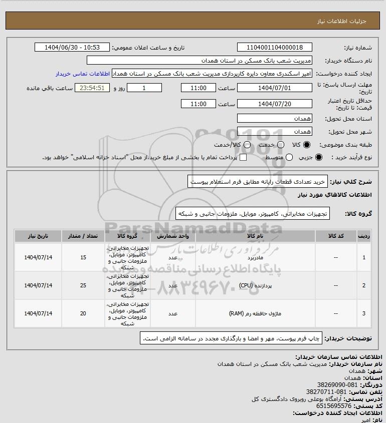 شرح کلی نیاز: خرید تعدادی قطعات رایانه مطابق فرم استعلام پیوست