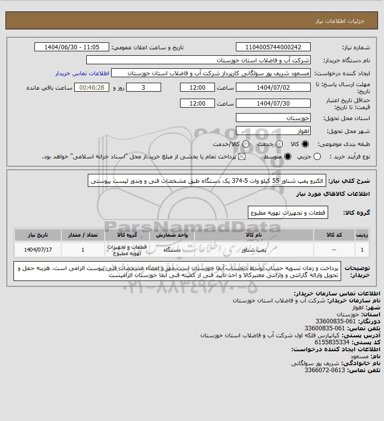 شرح کلی نیاز: الکترو پمپ شناور 55 کیلو وات 5-374 یک دستگاه طبق مشخصات فنی و وندور لیست پیوستی