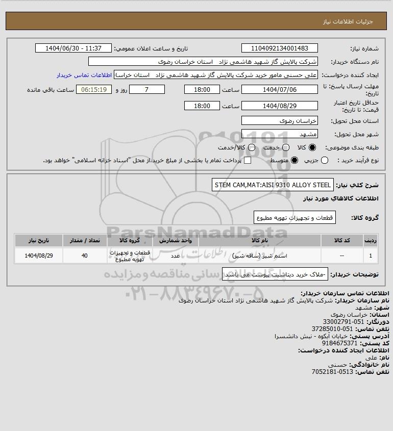 شرح کلی نیاز: STEM CAM,MAT:AISI 9310 ALLOY STEEL