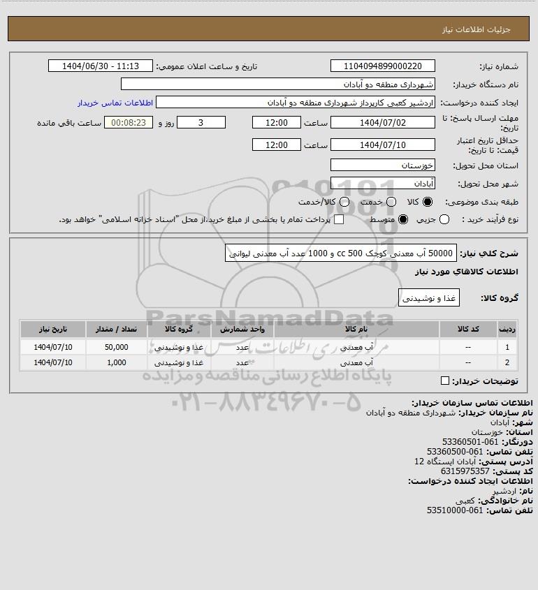 شرح کلی نیاز: 50000 آب معدنی کوچک 500 cc و 1000 عدد آب معدنی لیوانی