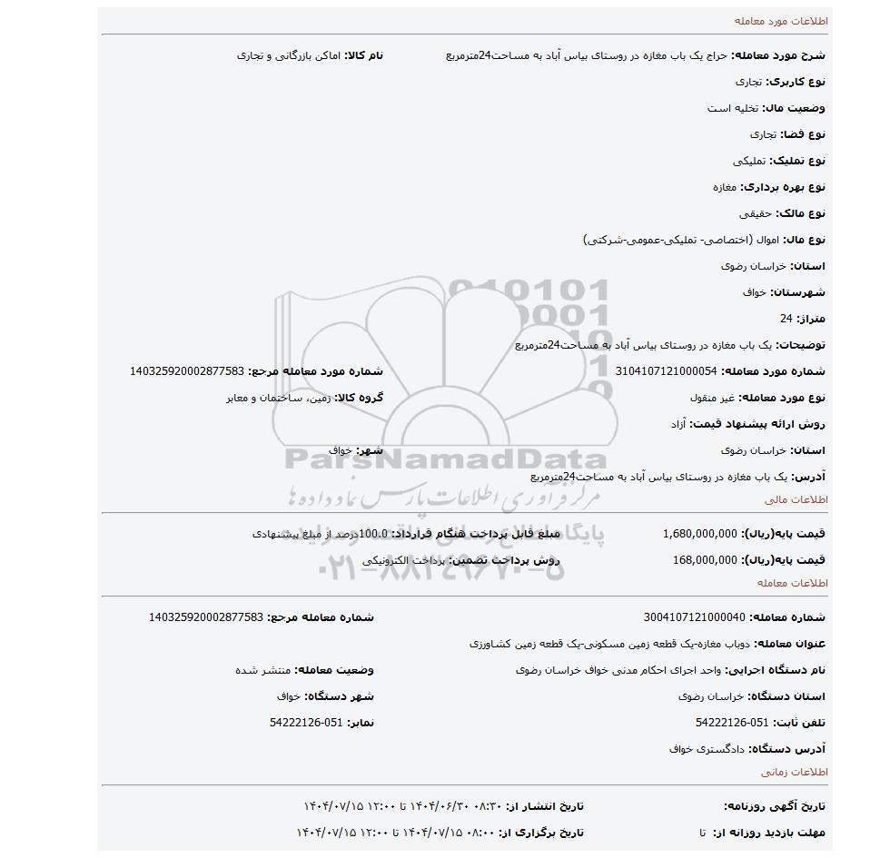 | شرح مورد معامله: حراج یک باب مغازه در روستای بیاس آباد به مساحت24مترمربع | نام کالا: اماکن بازرگانی و تجاری | |