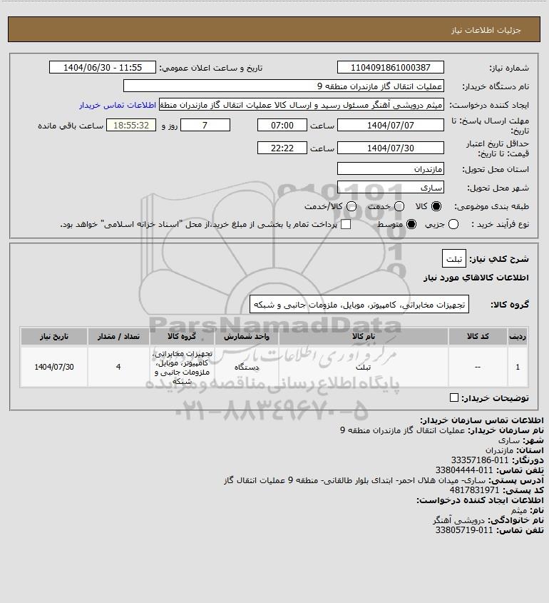 | 1 | -- | تبلت | دستگاه | تجهیزات مخابراتی، کامپیوتر، موبایل، ملزومات جانبی و شبکه | 4 | 1404/07/30 |