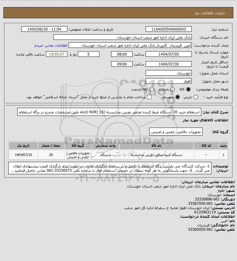 استعلام استعلام خرید 20 دستگاه ضبط کننده تصاویر دوربین مداربسته (NVR) 16 کاناله طبق مشخصات مندرج در برگه استعلام, استعلام استعلام خرید 20 دستگاه ضبط کننده تصاویر دوربین مداربسته (NVR) 16 کاناله طبق مشخصات مندرج در برگه استعلام