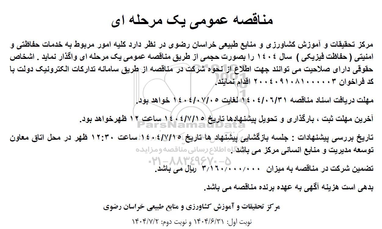 مرکز تحقیقات و آموزش کشاورزی و منابع طبیعی خراسان رضوی در نظر دارد کلیه امور مربوط به خدمات حفاظتی و امنیتی (حفاظت فیزیکی) سال 1404 را بصورت حجمی از طریق مناقصه عمومی یک مرحله ای واگذار نماید . اشخاص حقوقی دارای صلاحیت میتوانند جهت اطلاع از نحوه شرکت در مناقصه از طریق سامانه تدارکات الکترونیک دولت با کد فراخوان 2004091081000003 اقدام نمایند.