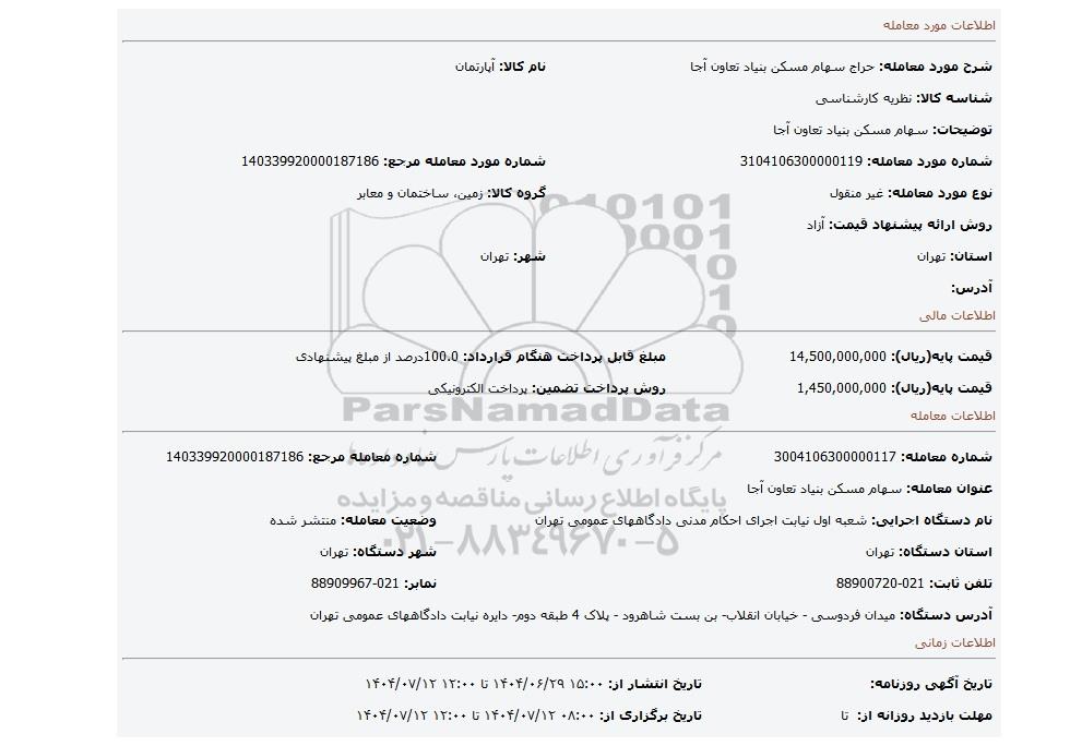 | شرح مورد معامله: حراج سهام مسکن بنیاد تعاون آجا | نام کالا: آپارتمان | |
