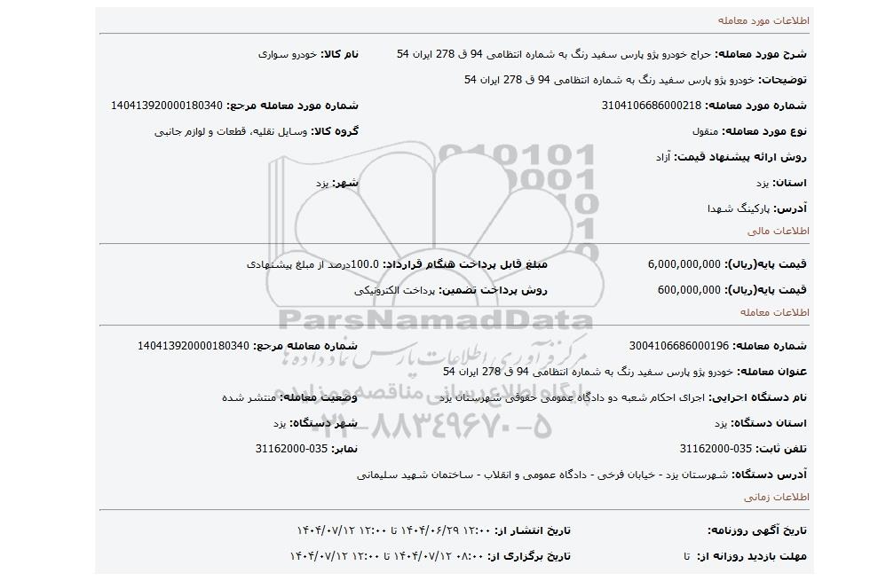 | عنوان معامله: خودرو پژو پارس سفید رنگ به شماره انتظامی 94 ق 278 ایران 54 | ||