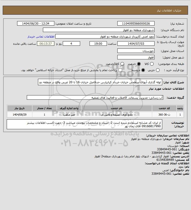 شرح کلی نیاز: لوله گذاری آبهای سطحی خیابان خرداد کیانپارس حدفاصل خیابان 16 تا 20 غربی واقع در منطقه دو