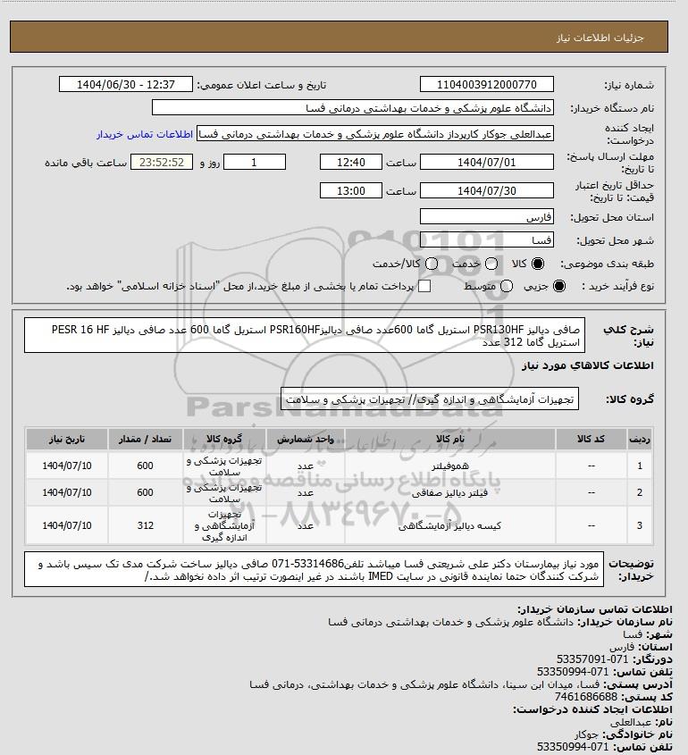 توضیحات خریدار:مورد نیاز بیمارستان دکتر علی شریعتی فسا میباشد تلفن53314686-071 صافی دیالیز ساخت شرکت مدی تک سیس باشد و شرکت کنندگان حتما نماینده قانونی در سایت IMED باشند در غیر اینصورت ترتیب اثر داده نخواهد شد./