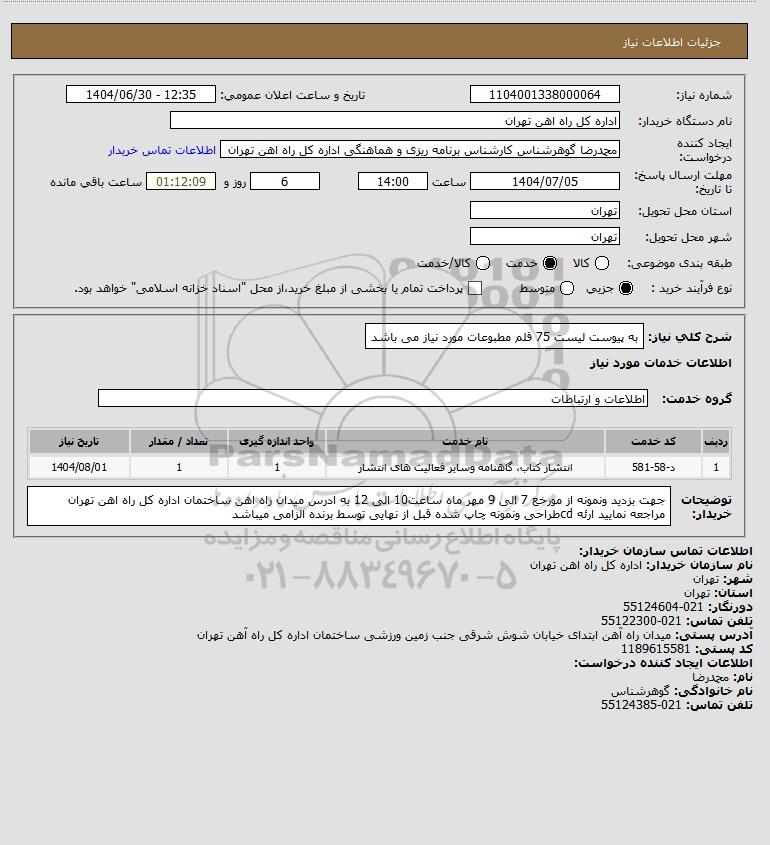 شرح کلی نیاز: به پیوست لیست 75 قلم مطبوعات مورد نیاز می باشد