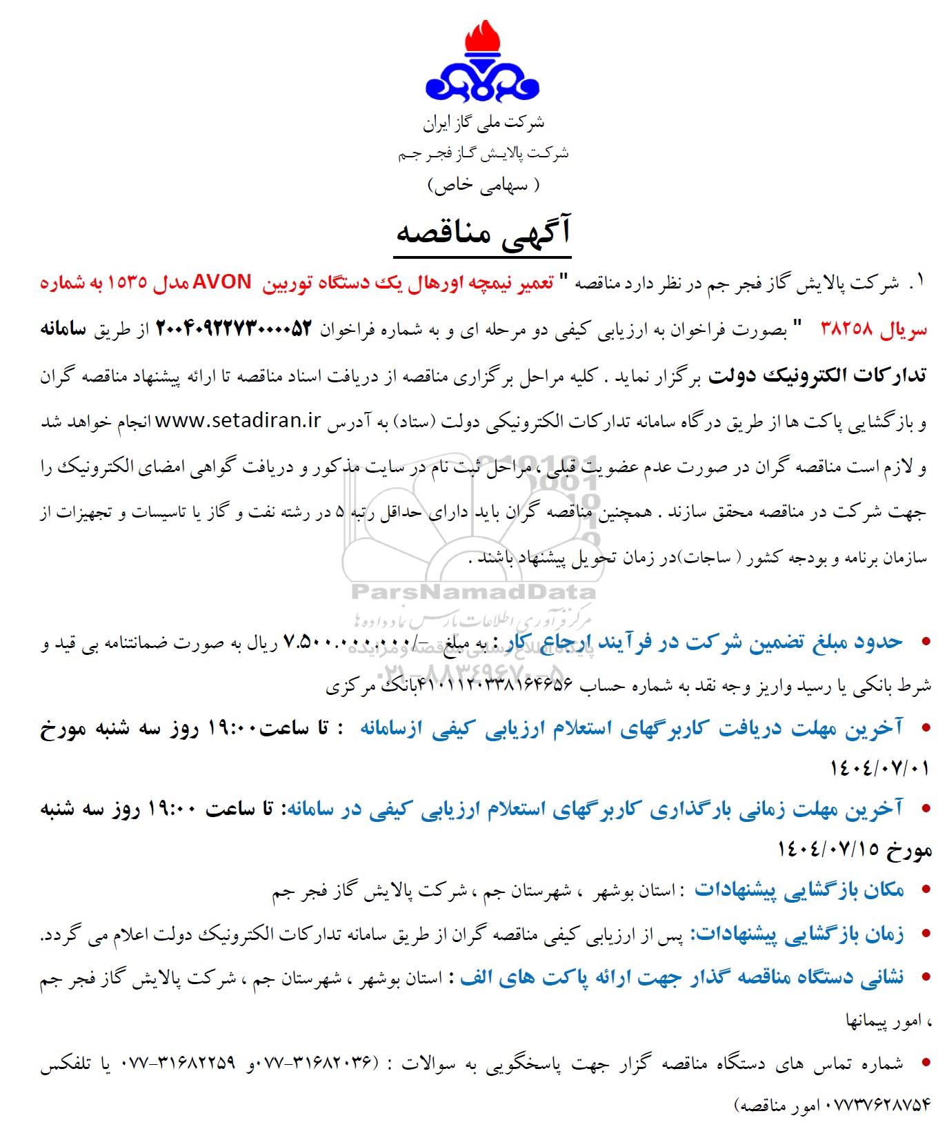 شرکت پالایش گاز فجر جم در نظر دارد مناقصه " تعمیر نیمچه اورهال یک دستگاه توربین AVON مدل 1535 به شماره سریال 38258 " بصورت فراخوان به ارزیابی کیفی دو مرحله ای و به شماره فراخوان 2004092273000052 از طریق سامانه تدارکات الکترونیک دولت برگزار نماید. کلیه مراحل برگزاری مناقصه از دریافت اسناد مناقصه تا ارائه پیشنهاد مناقصه گران و بازگشایی پاکت ها از طریق درگاه سامانه تدارکات الکترونیکی دولت (ستاد) به آدرس سایت ستاد ایران انجام خواهد شد و لازم است مناقصه گران در صورت عدم عضویت قبلی ، مراحل ثبت نام در سایت مذکور و دریافت گواهی امضای الکترونیک را جهت شرکت در مناقصه محقق سازند. همچنین مناقصه گران باید دارای حداقل رتبه 5 در رشته نفت و گاز یا تاسیسات و تجهیزات از سازمان برنامه و بودجه کشور (ساجات) در زمان تحویل پیشنهاد باشند .