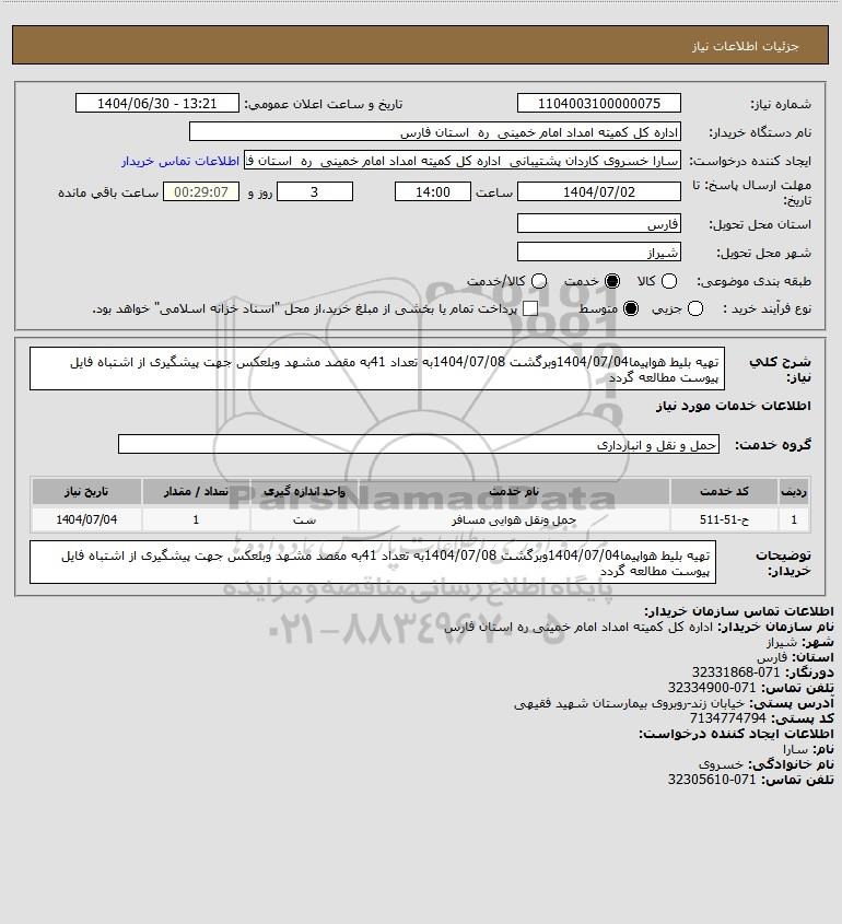 شرح کلی نیاز: تهیه بلیط هواپیما1404/07/04وبرگشت 1404/07/08به تعداد 41به مقصد مشهد وبلعکس جهت پیشگیری از اشتباه فایل پیوست مطالعه گردد