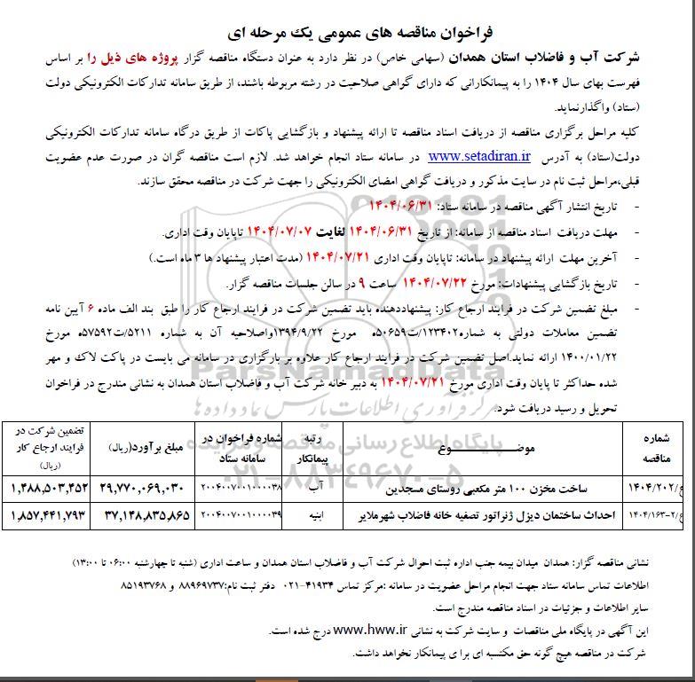 شرکت آب و فاضلاب استان همدان (سهامی خاص) در نظر دارد به عنوان دستگاه مناقصه گزار پروژه های ذیل را بر اساس فهرست بهای سال 1404 را به پیمانکارانی که دارای گواهی صلاحیت در رشته مربوطه باشند از طریق سامانه تدارکات الکترونیکی دولت (ستاد) واگذار نماید.