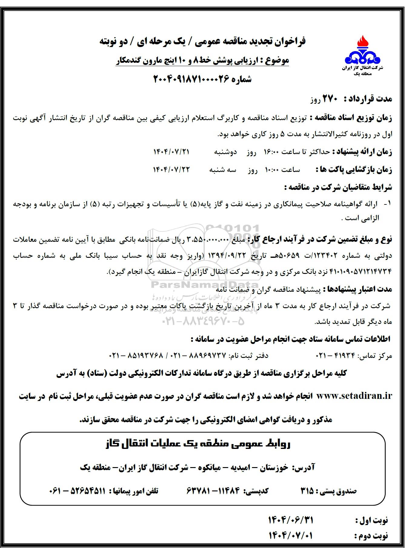 فراخوان مناقصه ارزیابی پوشش خط لوله 8 و 10 اینچ تجدید از کلیه افراد متخصص و شرکتها واجد شرایط دعوت به عمل میآید در مناقصه با کد خبرگزاری پارس نماد: 9579208 شرکت نمایند.