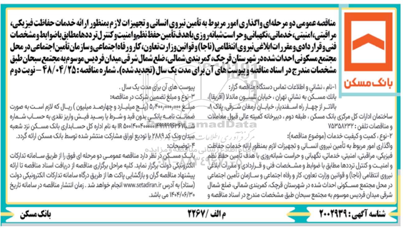 مناقصه عمومی دو مرحله ای واگذاری امور مربوط به تامین نیروی انسانی و تجهیزات لازم به منظور ارائه خدمات حفاظت فیزیکی، مراقبتی، امنیتی، خدماتی، نگهبانی و حراست شبانه روزی با هدف تامین حفظ نظم و امنیت و کنترل ترددها مطابق با ضوابط و مشخصات فنی و قراردادی و مقررات ابلاغی نیروی انتظامی (ناجا) و قوانین وزارت تعاون، کار و رفاه اجتماعی و سازمان تأمین اجتماعی در محل مجتمع مسکونی احداث شده در شهرستان قرچک، کمربندی شمالی، ضلع شمال شرقی میدان فردیس موسوم به مجتمع سبحان طبق مشخصات مندرج در اسناد مناقصه و پیوستهای آن برای مدت یک سال (تجدید شده) شماره مناقصه: 48/04/25 - نوبت دوم