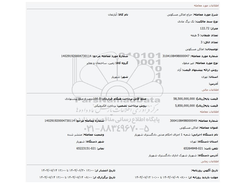 | شرح مورد معامله: حراج اماکن مسکونی | نام کالا: آپارتمان | |