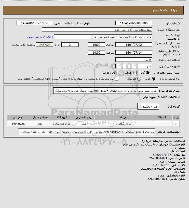 شرح کلی نیاز: خرید روغن سرخ کردنی یک ونیم لیتری به تعداد 300 عدد جهت اشپزخانه بیمارستان